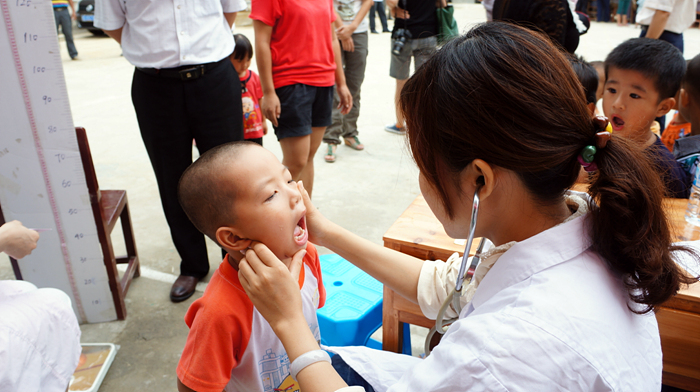 市妇幼保健院的医护人员为三贵村儿童检查口腔。黄祎婧/摄