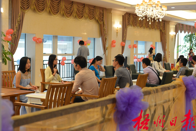 在三祺城售楼部二楼,宽敞却私密,15张四方桌一字排开,淡雅花束点缀桌面,15对才子佳人相对而坐,轻言细语,轻声细谈,深入了解。