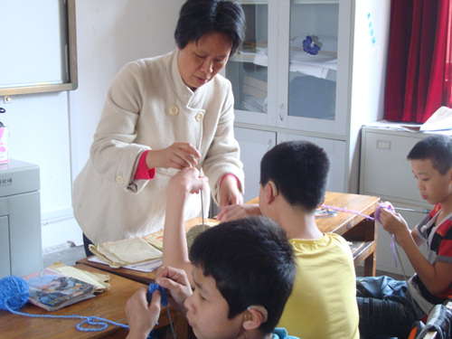 全少群教梧州市特殊教育学校的学生织毛线花。