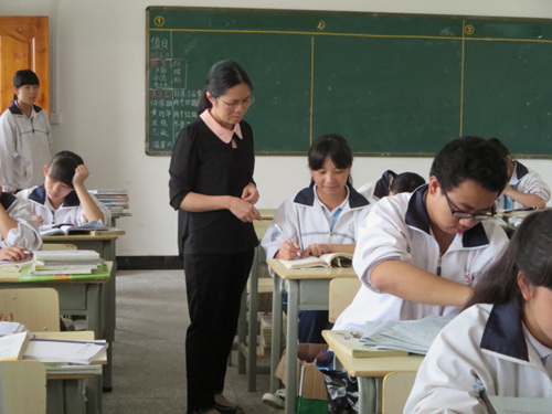 明冬梅指导学生复习作业。(蒙山县第二中学提供)