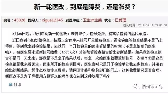 4月11日,网友“xigua12345”在梧州零距离网“零距离问政”平台发帖,表示近日到市妇幼保健院看病,先挂号开单缴费做检查,等拿到检查结果去找同一个医生看时,被医生要求重新挂号缴费,才能帮看结果。网友质疑,这样合理吗?