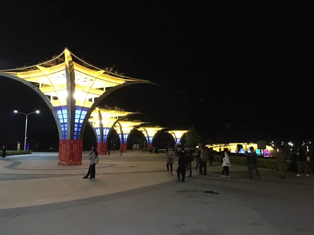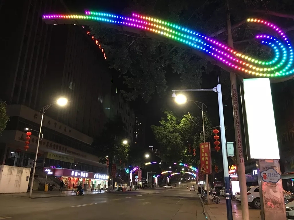 2018年12月,市政广场周边19处重要区域夜景亮化提升项目开建,对市总工会、市政府、市文化中心、市工人文化宫、中国电信大楼、市烟草局、中银大厦等19座建筑进行灯光夜景改造提升,设置LED洗墙灯、LED射灯、投光灯等夜景亮化设备。 经过夜景亮化提升项目后的市政广场周边区域,在五彩灯光照射下,一副色彩绚丽的灯光夜景图立马上线,周边洋溢着喜庆的春节气氛,市政广场周边建筑顶层、外立面随意转换的庆典红、庆典黄、庆典蓝三种灯光模式,更是让城市增添了浓浓的年味。 万秀区——“时光隧道”带你在“穿越”中感受年味