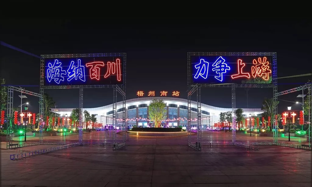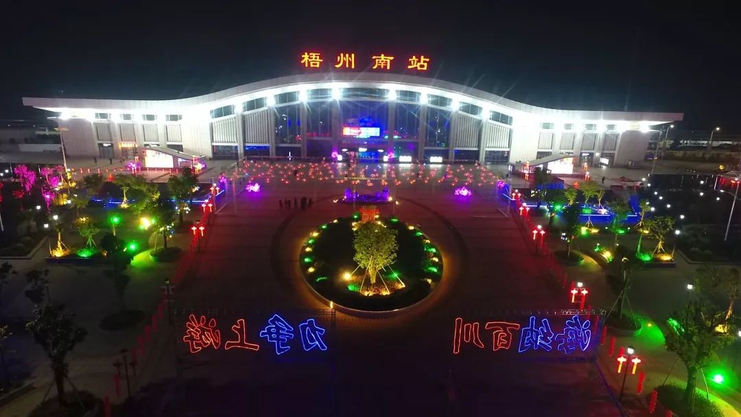 梧州南站站前广场也进行了亮化提升工程,以绚丽的灯光迎接宾客的到来。