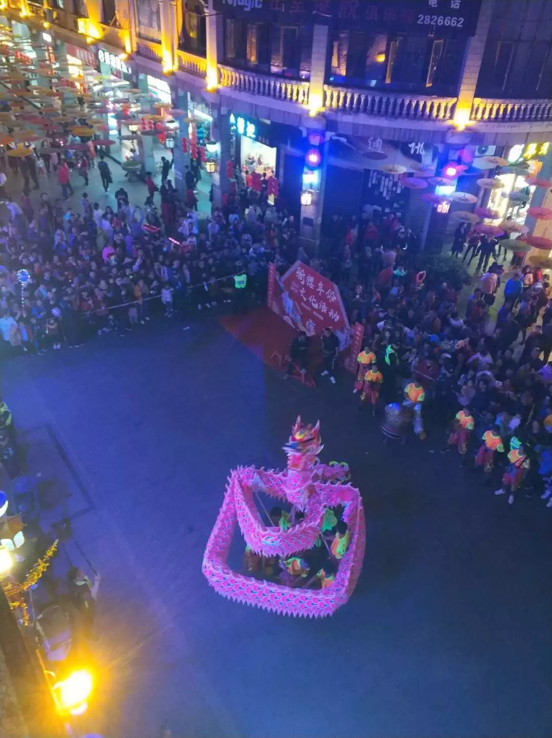 大年初一晚在骑楼城的夜光龙狮表演。