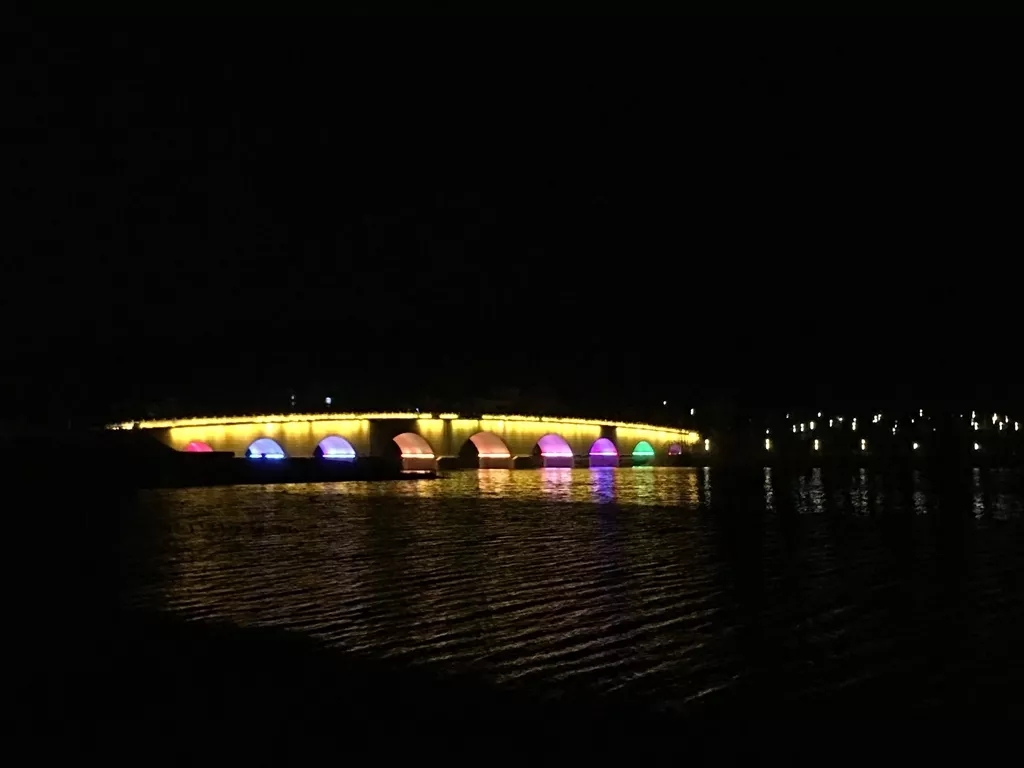苍海湖跨湖桥的桥身亮起五彩灯光。