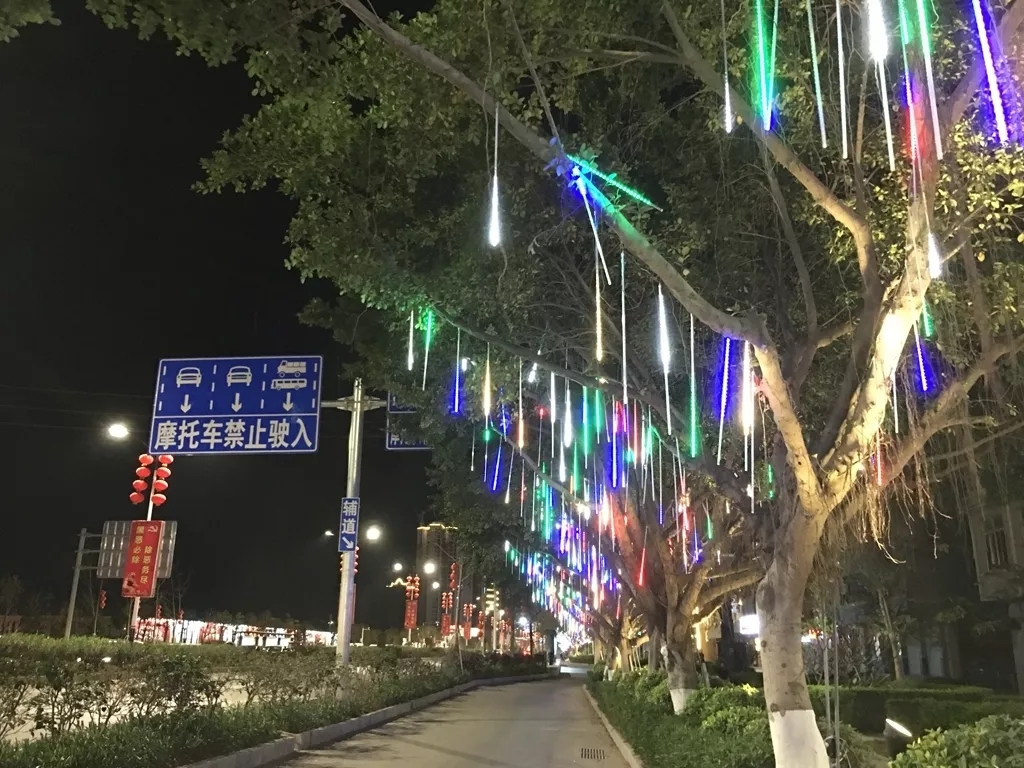 苍海大道旁的路树挂满了五彩的灯带,多彩炫目。