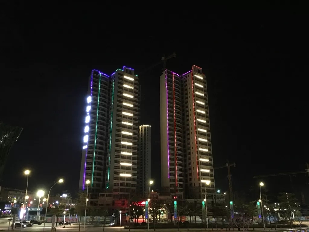 苍海公园旁的高楼大厦也亮起了五彩灯带。