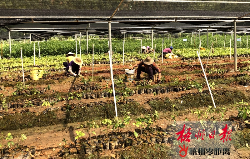 近日,在藤县古龙大红八角产业示范区八角种苗繁殖基地,工人们在筛选补种八角种苗。