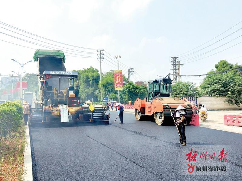 10月11日,在苍海大道社学路口附近,施工车辆正在铺设沥青路面。