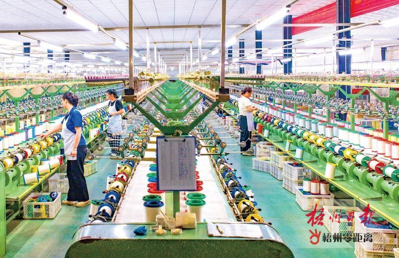 近日,蒙山县丝绸工业园区五丰丝绸有限公司织绸车间工人正在车间内工作。
